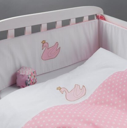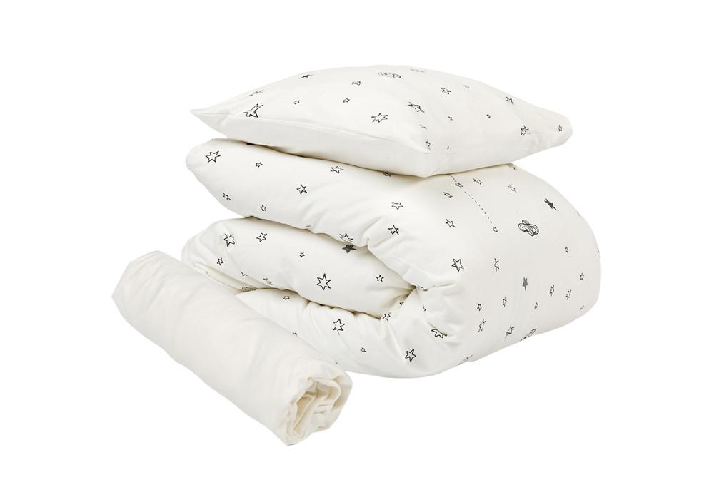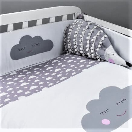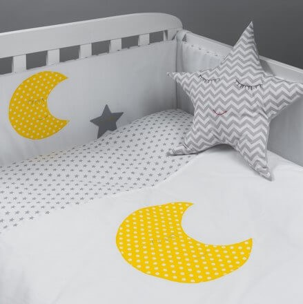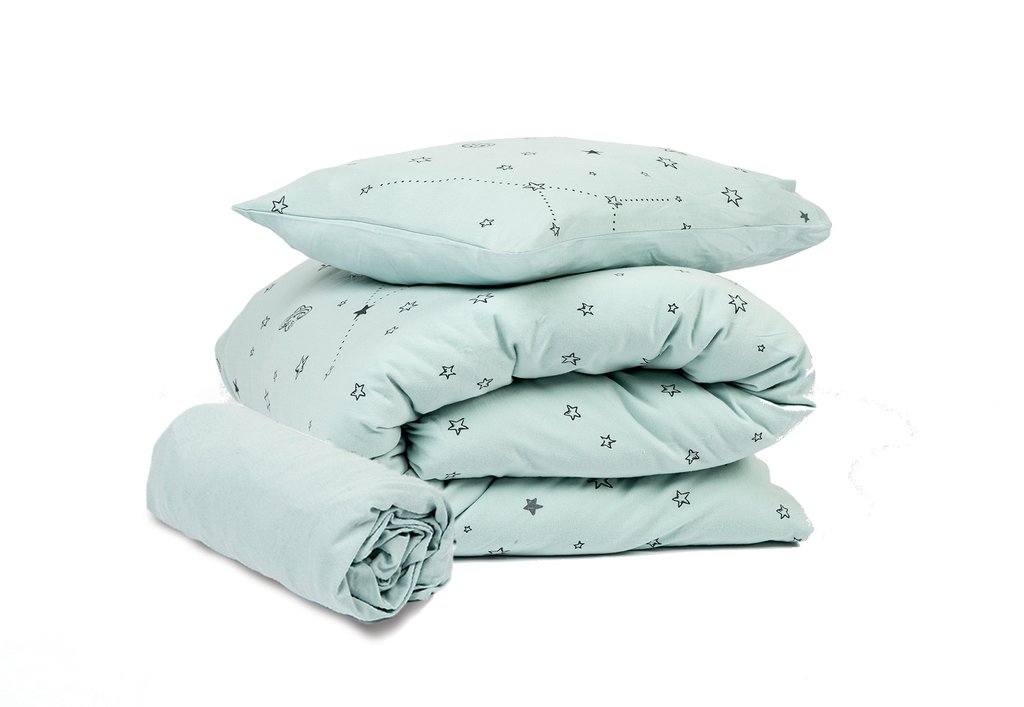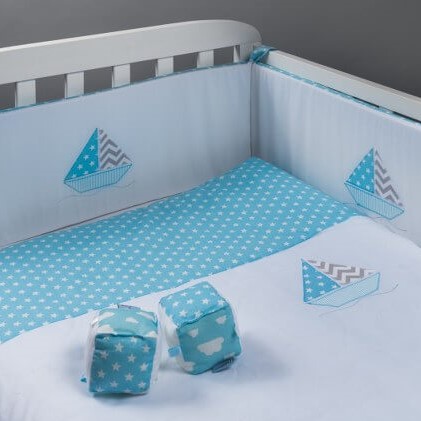סט מצעים לתינוק כולל שלושה חלקים : סדין, שמיכה ומגן ראש.